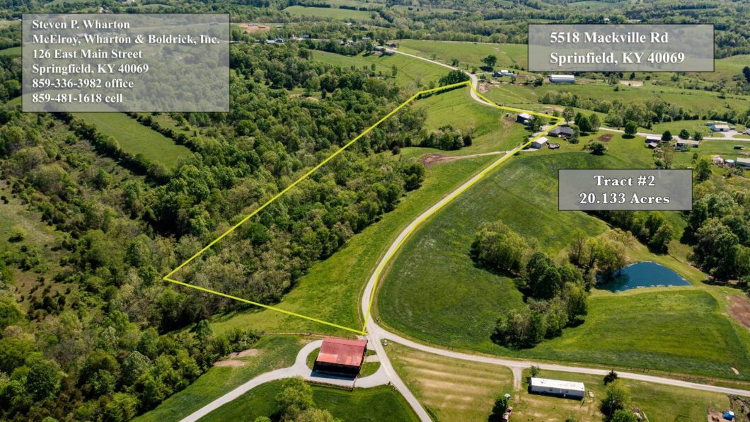 Beautiful 20.133-acre farm: woods/creek, great home site & barn. Beautiful 20.133 ac farm: woods/creek, multiple home sites & barn 20.133 acre MINI FARM or HOMESTEAD..!! Located at the entrance of Fenwick Lane where it intersects Mackville Road in the #5500 block. (*Only 4.4 miles to the Hwy 150 Bypass). This one is a PEARL and doesn’t need much introduction…!! This very special 20.133-acre parcel features the possibility of multiple home sites with easy access to county water and electric service. This tract boasts exceptional maintenance and features a good (72′ X 36′) tobacco barn w/side shed (12’x24′)and a barn lot at the rear, complete with a Ritchie automatic livestock waterer. There is good perimeter fencing, astonishing views at the rear (northern portion of the tract) overlooking a wooded hillside, valley and stream. This WILL NOT LAST ! — OFFERED @ $179,000. TOTAL ! LISTING BROKERED BY MCELROY, WHARTON AND BOLDRICK RE LLC, CALL 859/481-1618 OR 859/336-3982 FOR INFO.